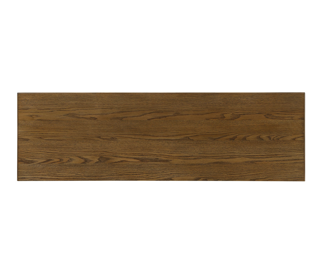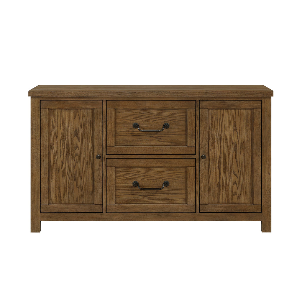 This functional and elegantly designed buffet cabinet, crafted from a combination of oak veneer, wood, and engineered wood with a rich brown finish, offers exceptional storage and style for your dining room or living space. It features two spacious dovetail drawers with smooth ball-bearing glides, perfect for organizing silverware and smaller items. Flanking these drawers are two cabinets, each with an adjustable shelf, providing versatile storage for larger serving dishes, linens, or other essentials. The flat black tone knobs and drop handles add a touch of classic sophistication to this practical and attractive piece. Assembly is required to complete this valuable addition to your home.