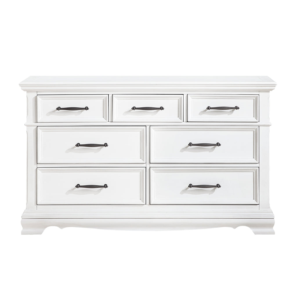 Elevate your bedroom's organization and aesthetic with this elegant White Wood 7-Drawer Dresser. Expertly crafted from a durable combination of solid wood and engineered wood, this dresser boasts a crisp white finish that instantly brightens any space. With seven spacious dovetail drawers, all equipped with smooth ball-bearing glides, you'll have ample room to neatly store clothing, linens, and accessories. The striking black nickel-tone bar pulls provide a stylish contrast, enhancing the dresser's timeless appeal. This versatile and robust piece offers both exceptional storage capacity and a refined look, making it a perfect addition to any modern or traditional bedroom.