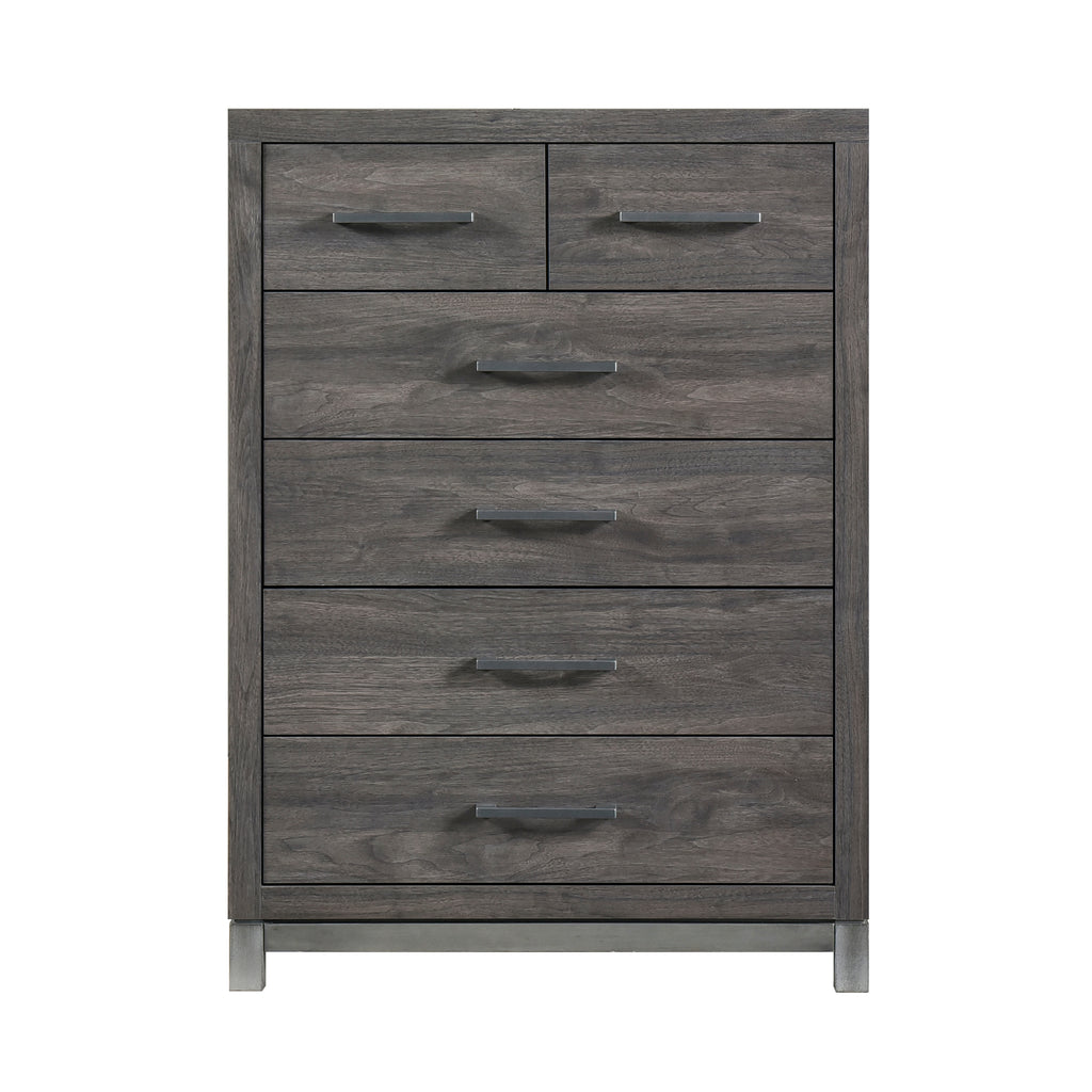 The sleek design of the Zephyr Collection pairs clean lines with modern convenience to create a style that will be the perfect palette for your design aspirations. Visually tying the chest together are the painted metal-finish banding of the base rail and the metal bar hardware that fronts each drawer, culminating in an accenting contrast to the dark gray faux wood finish of the melamine veneer.